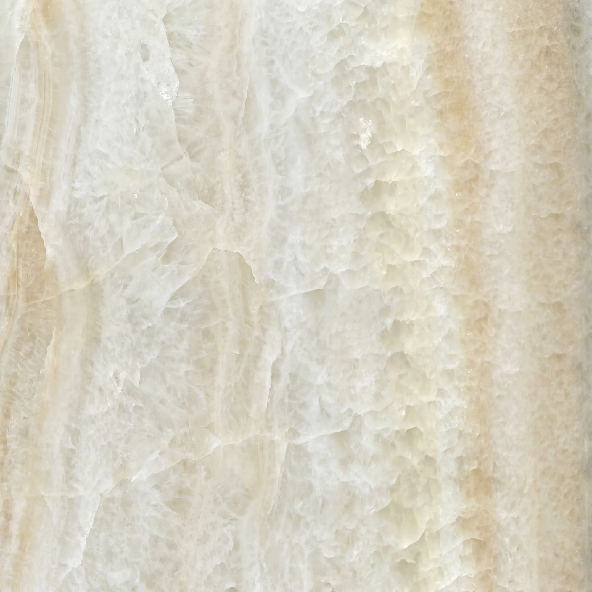 Onyx Arco Iris har en ljus bas med mjuka tonövergångar i elfenben, varm beige och ljus honung. Den lagerbyggda kristallstrukturen skapar djup och rörelse, där ljuset silas genom materialet. Varje skiva uppvisar naturliga variationer i ton och transparens.