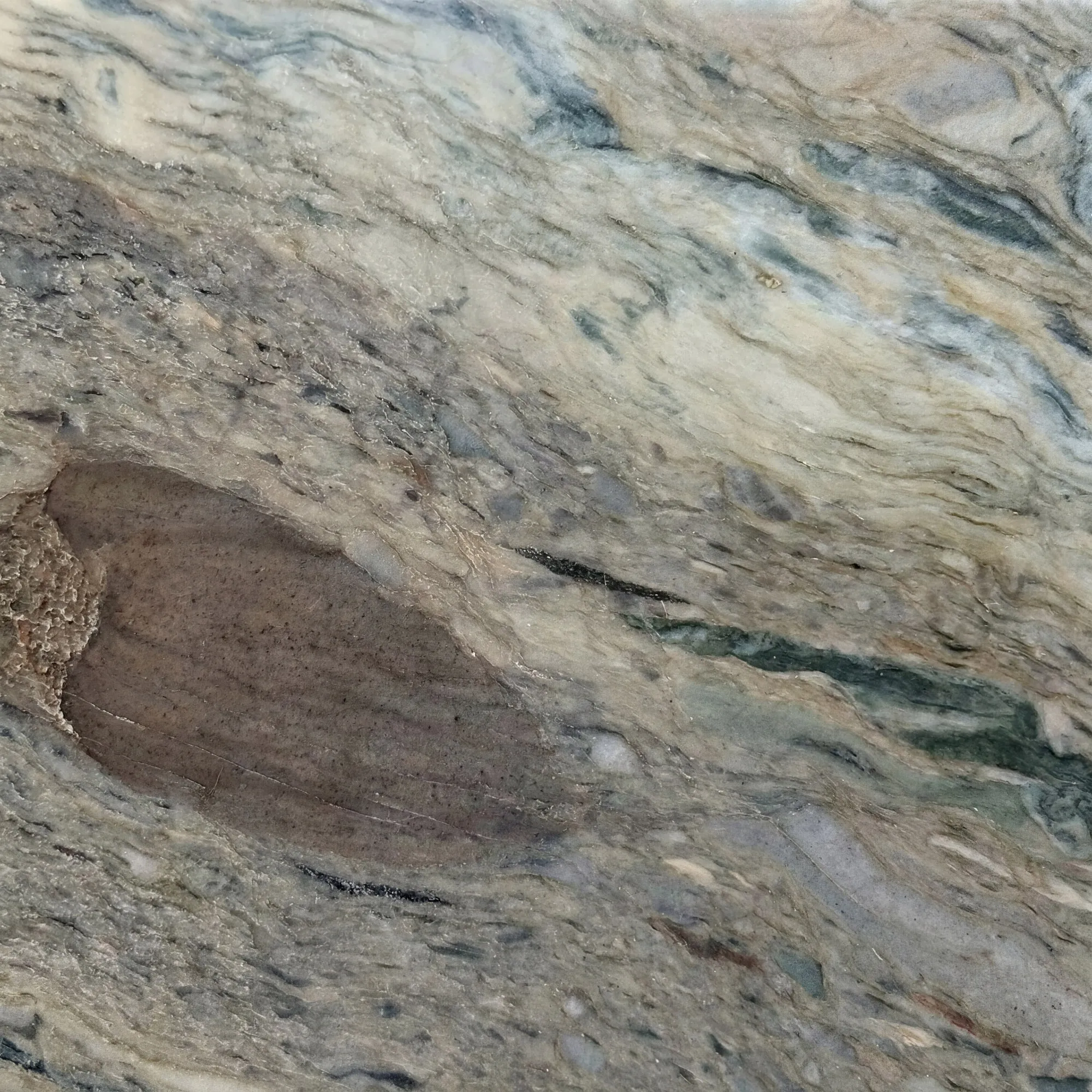 Fusion Wow är en kvartsit med tydlig skiktning och en komplex färgskala av blå, gröna, grå, gyllene och bruna toner. Ytan präglas av kraftig rörelse och skiftande mineralband som ger djup och variation över varje skiva. Uttrycket är markant och individuellt, vilket gör materialet lämpat för ytor där stenen får ta plats som ett tydligt visuellt element.