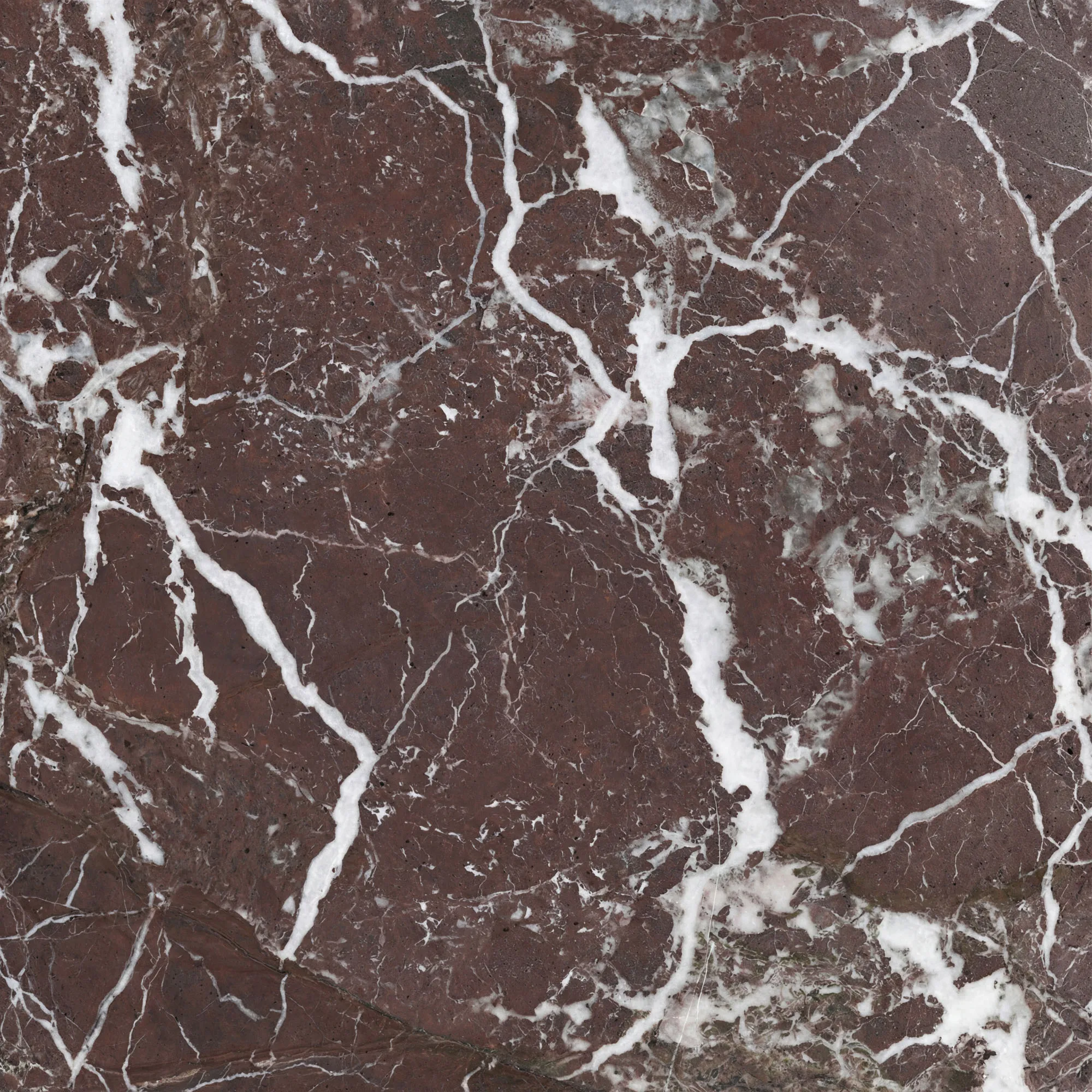 Rosso Levanto är en djupt röd marmor med tät, vinröd grundton och skarp vit ådring. Kontrasten är tydlig men samlad, med fina förgrenade linjer som skapar struktur snarare än rörelse. Den rika färgen och det kompakta uttrycket ger materialet en stabil och arkitektonisk närvaro.